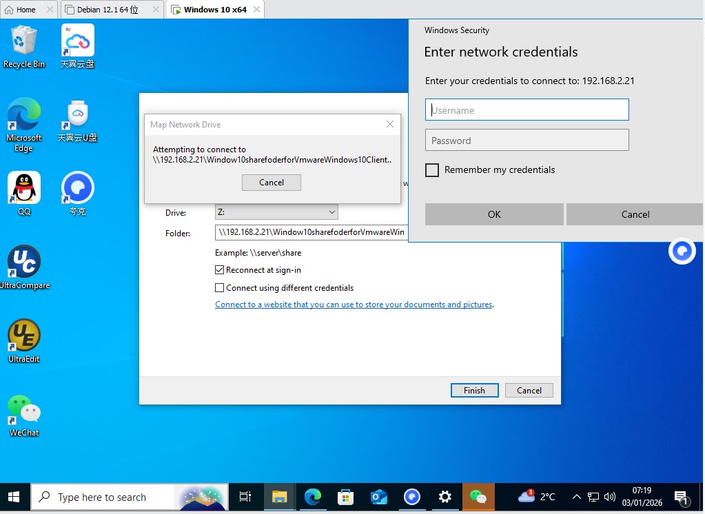 输入宿主操作系统的IP地址和共享文件夹名称,如\\192.168.2.21\Window10sharefoderforVmwareWindows10Client。